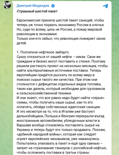 Введення шостого пакету санкцій проти Росії призведе до світової революції в економіці, а від європейських санкцій насамперед постраждають жителі країн Євросоюзу. Таку думку у своєму Telegram-каналі озвучив експрезидент РФ, заступник голови Ради безпеки Дмитро Медведєв. Зокрема, соратник Володимира Путіна розкритикував шостий пакет санкцій проти Росії та назвав європейських політиків "імбецилами". За його словами, часткове ембарго на постачання російської нафти свідчить про те, що Євросоюз не може одразу відмовитися від енергоресурсів і керівництву блоку зараз доводиться шукати альтернативні джерела палива, яке потрібне для вантажного транспорту та сільськогосподарської техніки.
