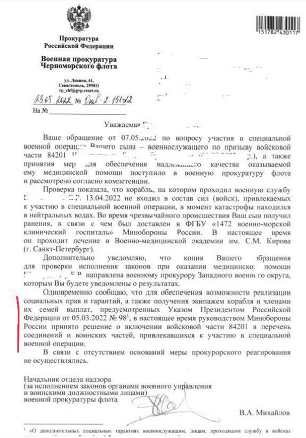 У документі, підписаному начальником відділу нагляду військової прокуратури флоту Вадимом Михайловим, зазначено, що корабель, на якому проходив службу син жінки, "не входив до складу сил, що залучаються до участі в спеціальній військовій операції та в момент катастрофи перебував у нейтральних водах". Водночас військову частину №84201, де служили моряки затонулого крейсера Москва, включили до переліку учасників "спецоперації" задля "забезпечення можливості дотримання соціальних прав і гарантій, а також отримання екіпажем корабля та членами їхніх сімей виплат". У відповіді прокуратури не уточнюється, коли саме частину було включено до списку.
