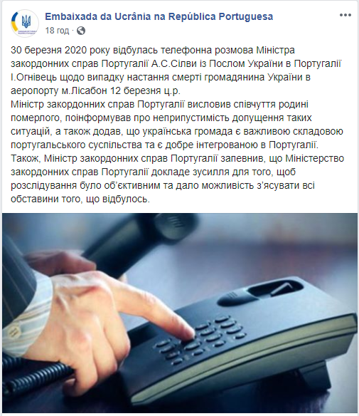 В свою чергу, ситуація із загибеллю українця стала відома на рівні дипломатичних відомств обох держав: міністр закордонних справ Португалії в телефонній розмові з послом України запевнив, що Міністерство закордонних справ Португалії докладе зусилля для того, щоб розслідування було об’єктивним та дало можливість з’ясувати всі обставини того, що відбулось.
