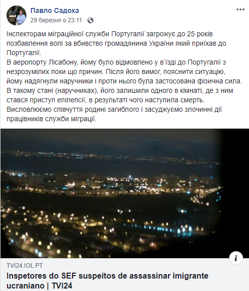 Про трагедію повідомив у Facebook інший українець Павло Садоха. За його словами, до нього звернувся знайомий загиблого з проханням допомогти з доставкою тіла. Він не знав про катування, і думав, що у потерпілого стався серцевий напад.