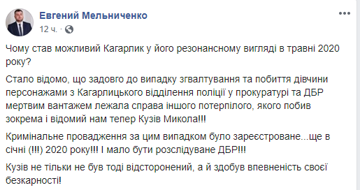 Адвокат Євген Мельниченко написав на своїй сторінці у Facebook, що задовго до випадку зґвалтування та побиття дівчини правоохоронцями з Кагарлицького відділення поліції, у прокуратурі Київської області та Державному бюро розслідувань "мертвим вантажем" лежала справа іншого потерпілого, якого побив зокрема і сумновідомий Кузів Микола. Мельниченко написав, що кримінальне провадження за цим випадком було зареєстроване ще в січні 2020 року і мало бути розслідуване ДБР. Але Кузів не тільки не був тоді відсторонений, а й здобув впевненість своєї безкарності, додав адвокат.