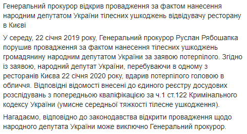 "У середу, 22 січня 2019 року, Генеральний прокурор Руслан Рябошапка порушив провадження за фактом нанесення тілесних ушкоджень громадянину народним депутатом України за заявою потерпілого. Згідно із заявою, народний депутат України, перебуваючи в одному з ресторанів Києва 22 січня 2020 року, вдарив потерпілого головою в обличчя. Відповідні відомості внесені до єдиного реєстру досудових розслідувань з попередньою кваліфікацією за ч.1 ст.122 Кримінального кодексу України (умисне середньої тяжкості тілесне ушкодження)", - йдеться у повідомленні.