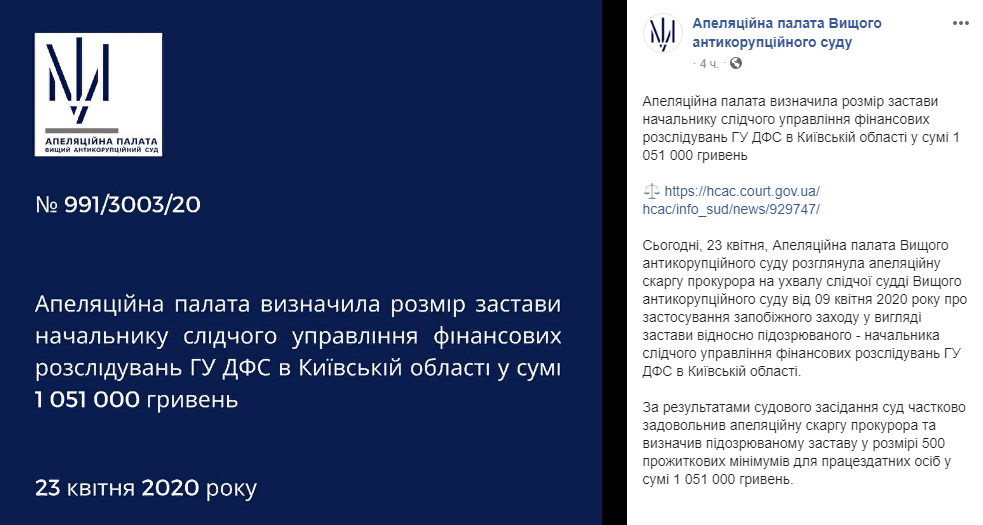 Як повідомили у ВАКС раніше, 9 квітня слідчий суддя ВАКС частково задовольнила клопотання прокурора та обрав запобіжний захід керівнику слідчого управління фінансових розслідувань Державної фіскальної служби однієї з областей у вигляді застави у розмірі 252 240 гривень. Так, 23 квітня суд частково задовольнив апеляційну скаргу прокурора та збільшив підозрюваному заставу у розмірі 500 прожиткових мінімумів для працездатних осіб у сумі 1 051 000 гривень.