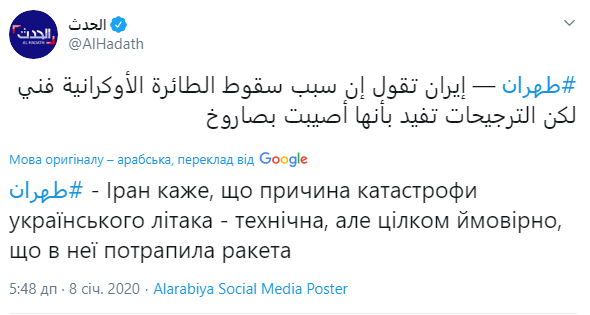 Йорданське видання Al-Hadath повідомило інформацію, яка імовірно визначає ймовірну причину катастрофи українського літака при зльоті з міжнародного аеропорту в Тегерані.