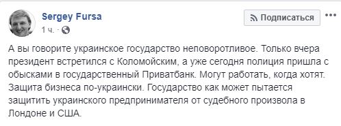 "А ви говорите українська держава неповоротка. Тільки вчора президент зустрівся з Коломойським, а вже сьогодні поліція прийшла з обшуками до державного "Приватбанка". Можуть працювати, коли хочуть. Захист бізнесу по-українськи. Держава як може намагається захистити українського підприємця від судового свавілля в Лондоні і США", - написав він.