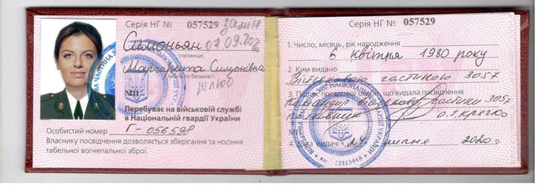 Як підтвердження радник глави МВС України опублікував фотошоп — "посвідчення" російської журналістки-пропагандистки Маргарити Симоньян, яка служить в НГУ. При цьому в "документі" були особисті дані Симоньян, написані від руки, та її фото в українській військовій формі.