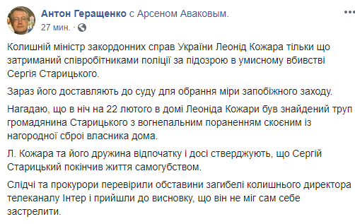 "Кожара та його дружина від початку і досі стверджують, що Сергій Старицький покінчив життя самогубством. Слідчі та прокурори перевірили обставини загибелі колишнього директора телеканалу Інтер і прийшли до висновку, що він не міг сам себе застрелити", - написав Геращенко.