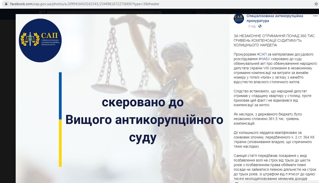 "Прокурорами САП за матеріалами досудового розслідування НАБУ скеровано до суду обвинувальний акт про обвинувачення народного депутата України VIII скликання в незаконному отриманні компенсації на витрати за винайм номеру у готелі "Київ" у зв’язку з начебто відсутністю власного житла в столиці", – йдеться в повідомленні.