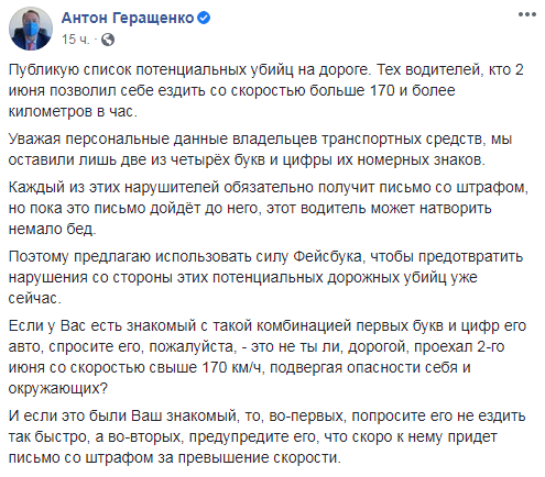 Заступник міністра внутрішніх справ Антон Геращенко на своїй сторінці у Facebook опублікував список потенційних вбивць на дорозі. Йдеться про тих водіїв, хто 2 червня дозволив собі їздити зі швидкістю понад 170 і більше кілометрів на годину.