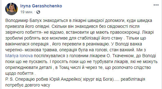 Ірина Геращенко, народна депутатка від "Європейської Солідарності" повідомила, що стан побитого Володимира Балуха стабільно важкий. Чоловіку провели складну операцію, він знаходиться у реанімації.