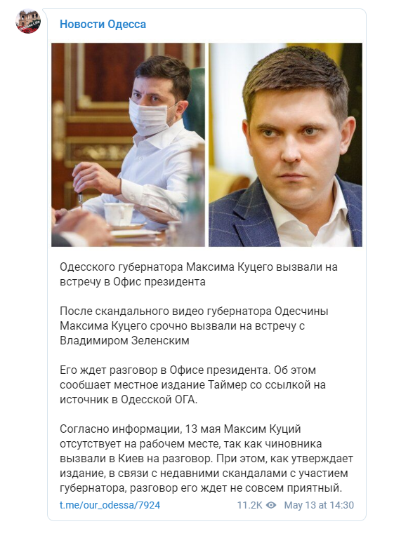 Глава Одеської облдержадміністрації Максим Куций не став відповідати на запитання журналістки щодо обставин закупівлі карет швидкої допомоги і спробував вигнати її з кабінету за допомогою нацгвардійців. Як повідомляє "Думська", відео з цим епізодом поширюється анонімними Telegram-каналами, також його опублікував журналіст "1+1". На запису видно, як чиновник відмовився відповідати на запитання журналістки, вимагав вимкнути камеру і видалити відео. Свій кабінет він назвав "режимним об'єктом", потім викликав працівників Нацгвардії, аби вигнати журналістів.