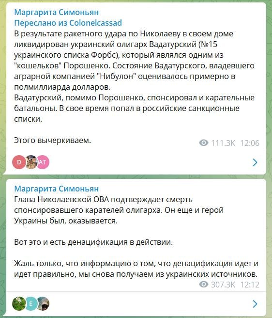 Зараз у соцмережах пропагандистів РФ повідомляють, що був ліквідований «спонсор каральних батальйонів» та інша відверта брехня. «Навіть Симон’ян чорним ротом почала говорити щось про принципи та ідейність Олексія Вадатурського. Це просто гидко читати», - прокоментував нардеп Олексій Гончаренко.