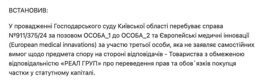 Наразі суддя Заєць вже розглянув матеріали справи про переведення прав та обов’язків покупця частки у статутному капіталі за позовом Бродського Юрія Михайловича до Шуфрича Івана Юлійовича, «Європейські медичні інновації» «за участю третьої особи, яка не заявляє самостійних вимог щодо предмета спору». На стороні відповідачів – ТОВ ТОВ «Реал Груп».