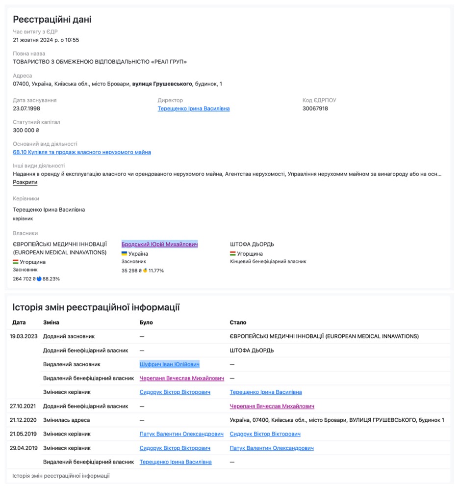 Тож повернемося до ТОВ «Реал Груп» (Код ЄРДПОУ 30067918). Компанією фактично володіють Нестор Шуфрич та Юрій Бродський (на 88.23% та 11.7% відповідно). До травня 2022 року частина Шуфрича була оформлена на вищезгаданого В’ячеслава Черепаню, також нині звинуваченого у державній зраді. Потім ця частина була переоформлена на батька Нестора Шуфрича – Шуфрича Івана Юлійовича.