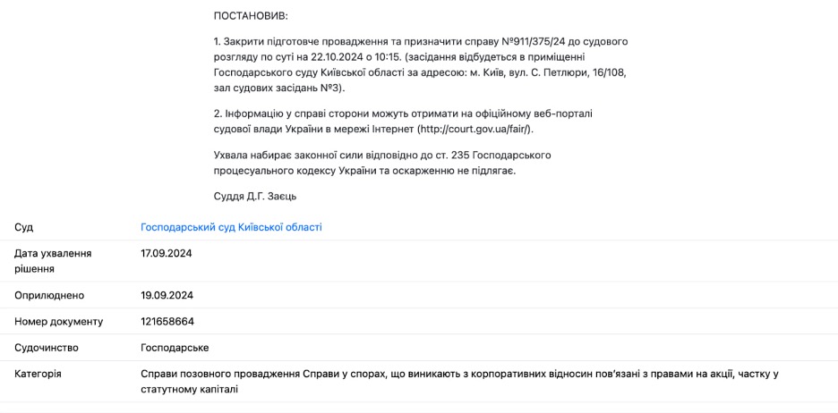 Частину справи вже зроблено - 22.10.2024 о 10:15 призначено справу №911/375/24 до судового розгляду по суті (засідання відбудеться в приміщенні Господарського суду Київської області за адресою: м. Київ, вул. С. Петлюри, 16/108, зал судових засідань №3).