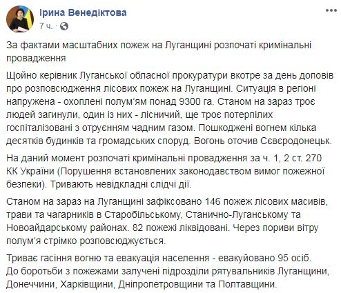 Крім того, є інформація, що вогняна стихія вже забрала життя трьох людей, одним з яких був лісничий. Ще трьох отруєних чадним газом доставили в лікарню. Також Венедиктова повідомила про пошкодження вогнем декількох десятків будинків. За її словами, за фактами масштабних пожеж на Луганщині розпочато кримінальні провадження.