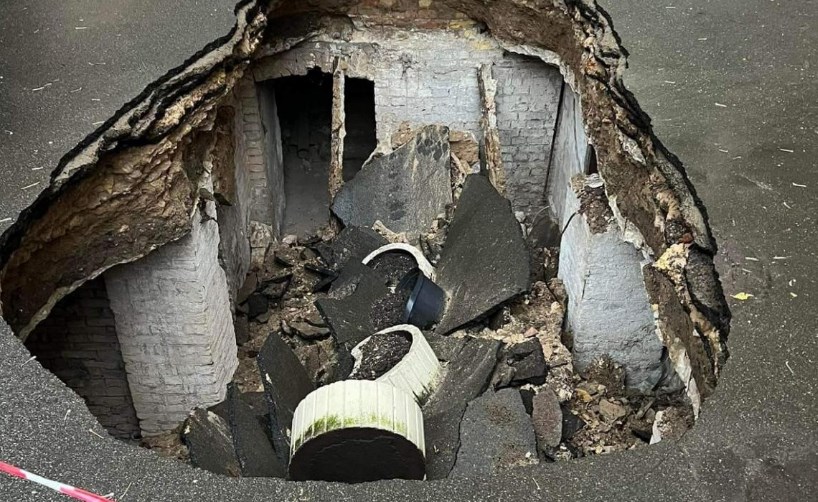 Асфальт у Києві раптово провалився по вулиці Мала Житомирська. Яма відкрила підвал садиби початку ХІХ століття.