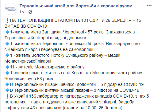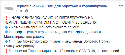 Як повідомляє на своїй сторінці у Facebook Тернопільський штаб для боротьби з коронавірусом, у чотирьох лікарів з Тернопільської області підтвердили діагноз коронавірус.