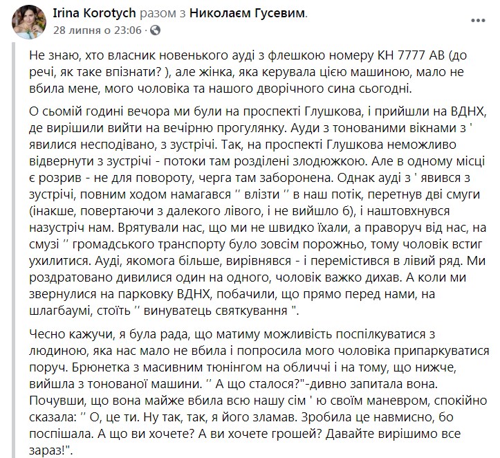 ДТП відбулася ввечері 28 липня на проспекті Глушкова. Блогерка перебувала в автівці разом із чоловіком і дворічним сином. У цей момент автомобіль Audi "несподівано, із зустрічної, кинувся їм у бік". Небезпечний маневр ледве не спровокував страшну аварію.