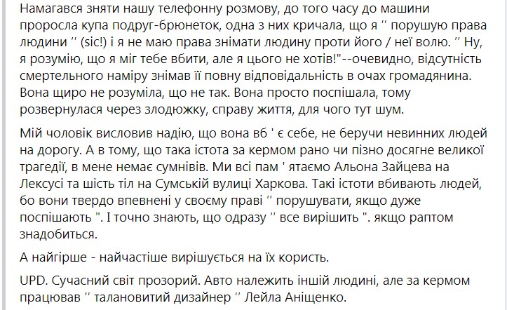 Ірина Коротич згодом з'ясувала, що за кермом Audi була дизайнерка Лейла Аніщенко. Власником автівки Audi з пафосними номерами КН 7777 АВ є інша людина.