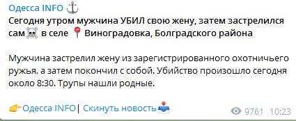 Про це повідомляє в Телеграм-каналі місцевий паблік Одеса Інфо. Повідомляється, що вбивство сталося сьогодні вранці. Після вбивства дружини чоловік наклав на себе руки. Тіла подружжя виявили їхні родичі.
