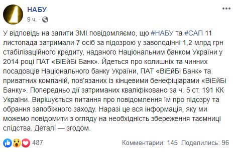 "У відповідь на запити ЗМІ повідомляємо, що НАБУ та САП 11 листопада затримали 7 осіб за підозрою у заволодінні 1,2 млрд грн стабілізаційного кредиту, наданого Національним банком України у 2014 році ПАТ «ВіЕйБі Банк». Йдеться про колишніх та чинних посадовців Національного банку України, ПАТ «ВіЕйБі Банк» та приватних компаній, пов’язаних із кінцевими бенефіціарами «ВіЕйБі Банку». Попередньо дії затриманих кваліфіковано за ч. 5 ст. 191 КК України. Вирішується питання про повідомлення їм про підозру та обрання запобіжного заходу. Наразі це вся інформація, яку ми можемо повідомити з огляду на необхідність збереження таємниці слідства. Деталі — згодом", - повідомляє НАБУ