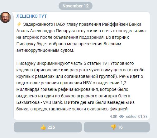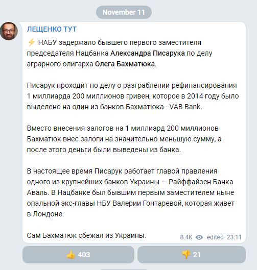 У свою чергу, колишній депутат Верховної Ради 8 скликання, журналіст Сергій Лещенко у своєму Телеграм-каналі паралельно повідомив 11 листопада, що НАБУ затримало колишнього першого заступника голови Нацбанку Олександра Писарука по справі аграрного олігарха Олега Бахматюка.