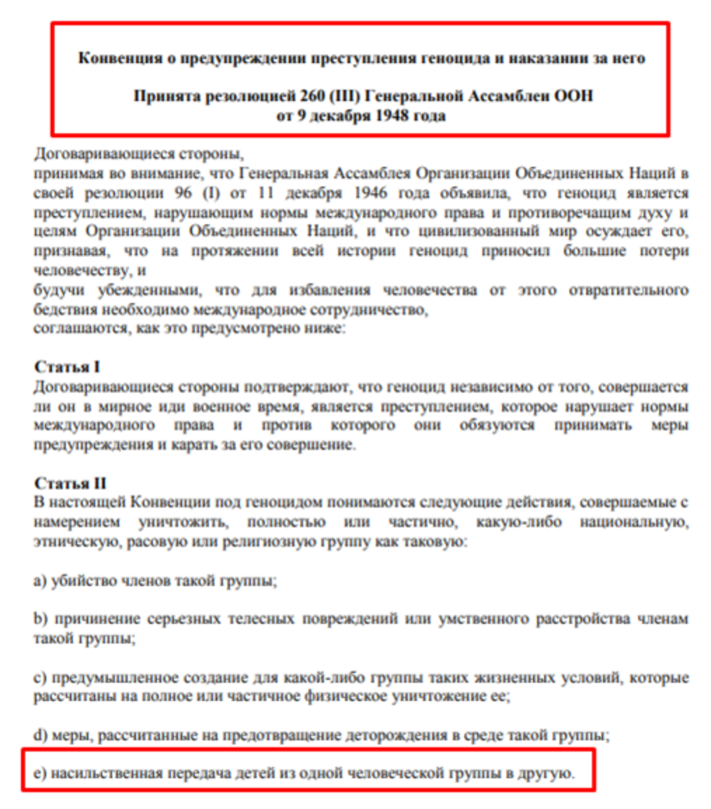 Однак усиновлення маленьких українців розпочалося ще 2014 року. Тоді дітей із Криму почали вивозити на материкову частину РФ. Тоді цю “ініціативу” назвав кремль “Потяги надії” і це призвело до насильницької депортації 1 тис. дітей. За шість днів до початку повномасштабного вторгнення, агресор почав масове вивезення дітей з окупованих частин Донбасу. Майже через три тижні, 8 березня, газета «Le Monde» опублікувала відкритий лист, написаний групою дитячих психологів та інтелектуалів, в якому говорилося, що дії російської сторони мають ознаки геноциду. Також текст говорив: “Вимушене переміщення неповнолітніх з України до Росії – частина проєкту Володимира Путіна щодо викорінення української ідентичності та нації”. Автори не робили безпідставних звинувачень. Насильницька депортація дітей є як однією з ознак військових злочинів, так і актом геноциду. Адже відповідно до Конвенції про запобігання злочину геноциду та покарання за нього, прийнятої Генеральною Асамблеєю ООН у 1948 році, поняття “геноцид – означає насильницьку передачу дітей однієї групи іншій групі” (Стаття II, (е)). 19 лютого 2023 року держсекретар США Ентоні Блінкен заявив програмі CBS News: “Ця практика, яку батьку майже неможливо зрозуміти - буквально, “відбирати” українських дітей, відправляти їх до росії, відправляти до центрів, яких ми виявили, близько 43. Розлучаючи їх із сім'ями, а потім, усиновлюючи росіянами, саме по собі – жахливо! Це також свідчить про те, що президент путін із першого дня намагався стерти ідентичність України, стерти її майбутнє. Ось що відбувається і це теж злочин проти людства”.