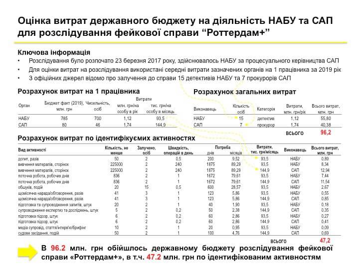 Для того щоб розслідувати справу "Роттердам+" з Національного антикорупційного бюро та Спеціалізованої антикорупційної прокуратури були надані детективи, діяльність яких "потягнула" на 96 мільйонів гривень. Слідство велося три з половиною роки, проте результатів так і не дало.