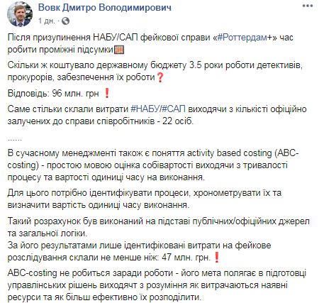 "Після призупинення НАБУ / САП фейкової справи "Роттердам+" час робити проміжні підсумки. Скільки ж коштувало державному бюджету 3,5 роки роботи детективів, прокурорів, забезпечення їх роботи? Відповідь: 96 млн грн", – повідомив Вовк.
