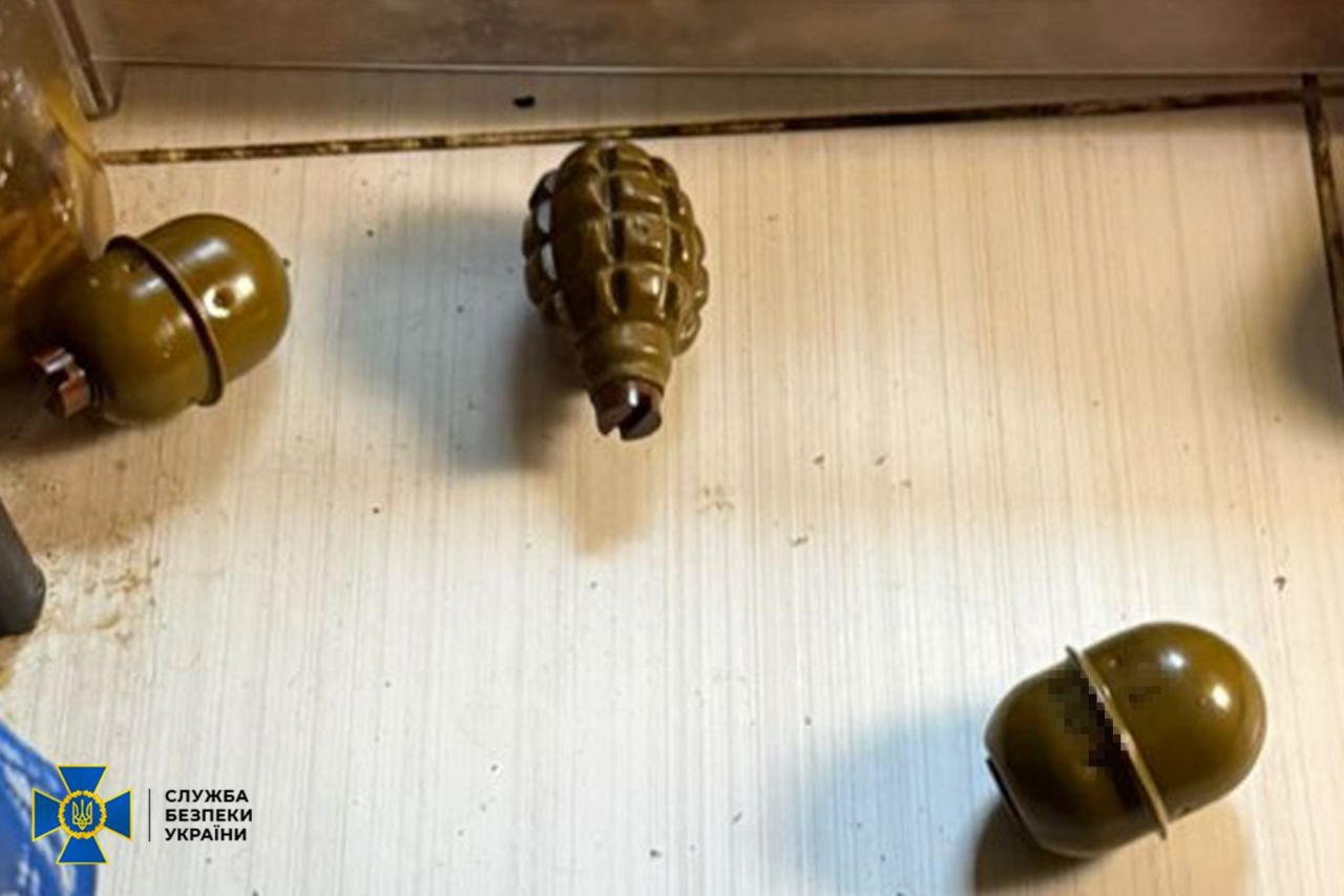 Під час обшуків у затриманого правоохоронці вилучили саморобну бомбу, складові для виготовлення вибухових пристроїв, мобільний телефон із доказами контактів з представниками рф, а також бойові гранати.