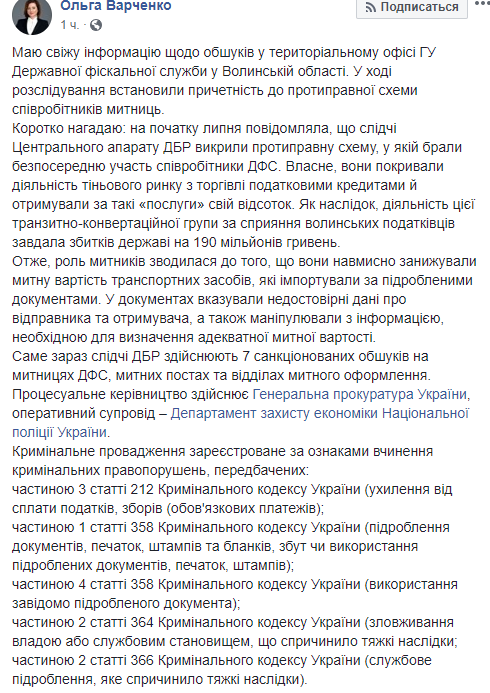 "Слідчі Центрального апарату ДБР викрили протиправну схему, у якій брали безпосередню участь співробітники ДФС. Вони покривали діяльність тіньового ринку з торгівлі податковими кредитами й отримували за такі "послуги" свій відсоток. Як наслідок, діяльність цієї транзитно-конвертаційної групи за сприяння волинських податківців завдала збитків державі на 190 мільйонів гривень", - розповіла Варченко.