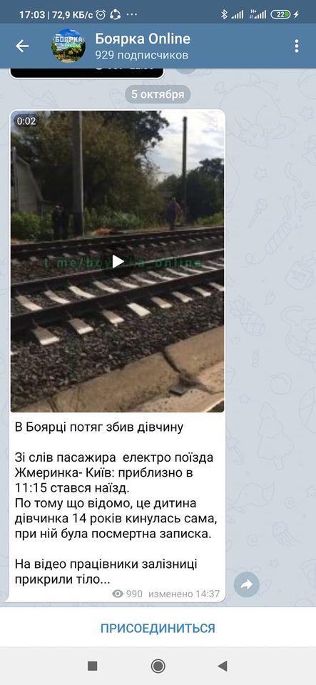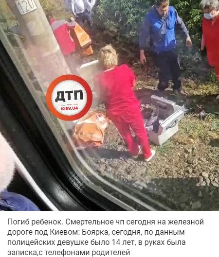 "Загинула дитина. Смертельна НП сьогодні на залізниці під Києвом: Боярка, сьогодні, за даними поліцейських дівчині було 14 років, в руках була записка з телефонами батьків", - повідомляє канал.