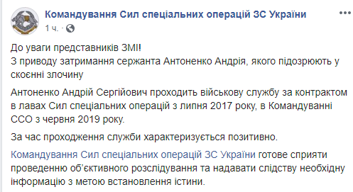 "З приводу затримання сержанта Антоненко Андрія, якого підозрюють у скоєнні злочину. Антоненко Андрій Сергійович проходить військову службу за контрактом в лавах Сил спеціальних операцій з липня 2017 року, в Командуванні ССО з червня 2019 року. За час проходження служби характеризується позитивно. Командування Сил спеціальних операцій ЗС України готове сприяти проведенню об’єктивного розслідування та надавати слідству необхідну інформацію з метою встановлення істини", - написала пресслужба Командування Сил спеціальних операцій ЗС України.