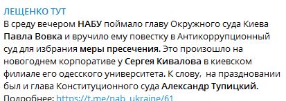 "У середу ввечері НАБУ зловило голову Окружного суду Києва Павла Вовка і вручило йому повістку в Антикорупційний суд для обрання запобіжного заходу. Це сталося на новорічному корпоративі у Сергія Ківалова в київській філії його Одеського університету", - пише Лещенко.