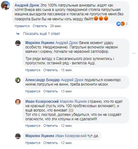 У коментарях треду один з очевидців аварії повідомив, що патрульні перед тим, як рухатися на "червоне світло", включили сирену і "червоні маячки".
