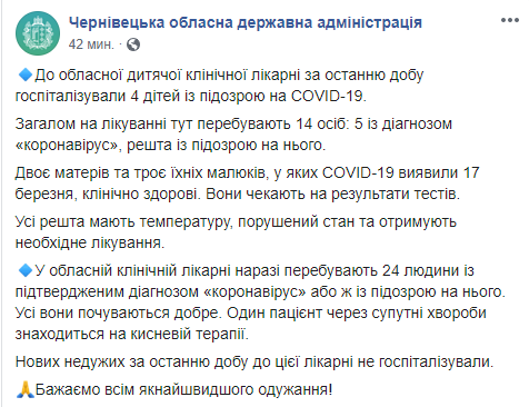 Чернівецька обласна державна адміністрація повідомляє, що в обласній клінічній лікарні є 24 пацієнта із підтвердженим діагнозом коронавірус або ж із підозрою на нього. Один пацієнт через супутні хвороби знаходиться на кисневій терапії.