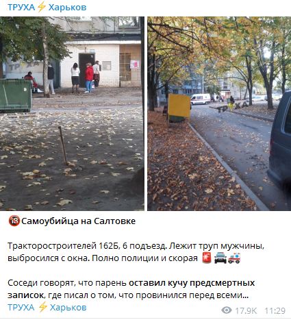 "Тракторобудівників, 162б, 6 під'їзд. Лежить труп чоловіка, викинувся з вікна. Повно поліції і швидка. Сусіди кажуть, що хлопець залишив купу передсмертних записок, де писав про те, що завинив перед усіма", - повідомляється в Телеграм-каналі харківського пабліку.