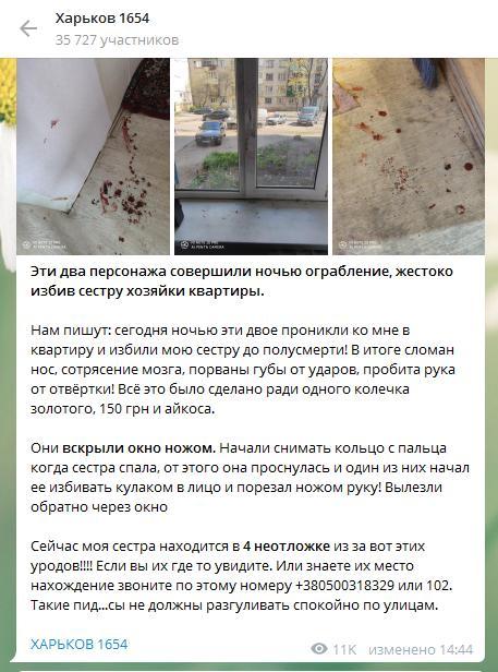 Паблік повідомляє, що двоє зловмисників через вікно проникли у квартиру, де знаходилися дві сестри. Одну з жінок злочинці піддали справжнім катуванням, зламавши їй побоями кістки носа і спровокувавши струс головного мозку. Крім того, як повідомила господиня квартири, вона ж сестра постраждалої, жінці злочинці пробили руку викруткою.