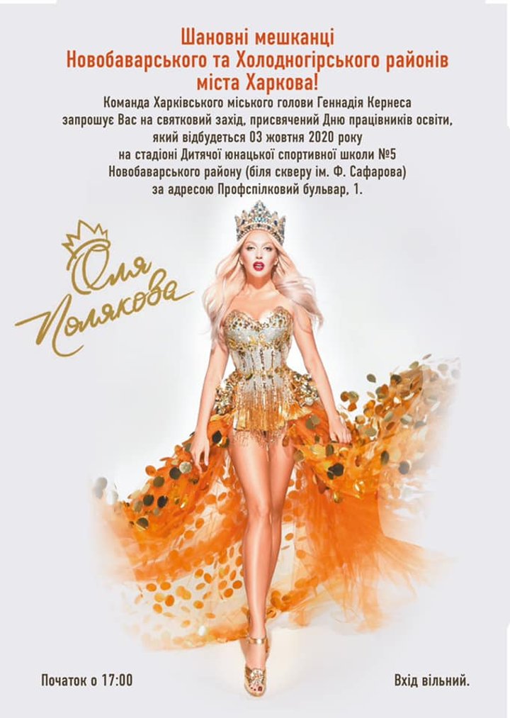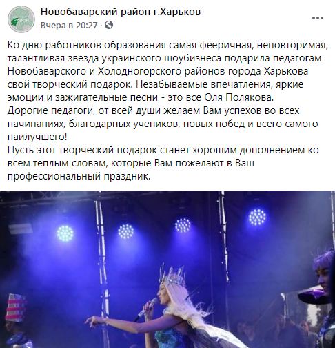 На сторінці у Facebook "Новобаварський район м. Харків" було зазначено, що Ольга Полякова подарувала "незабутні враження, яскраві емоції та запальні пісні" до Дня працівників освіти. "До Дня працівників освіти сама феєрична, неповторна, талановита зірка українського шоу-бізнесу подарувала педагогам Новобаварського та Холодногірського районів міста Харкова свій творчий подарунок. Незабутні враження, яскраві емоції та запальні пісні — це все Оля Полякова", - йдеться в повідомленні сторінки.