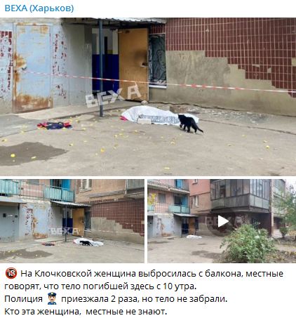 Також повідомляється, що накритий труп під під'їздом знаходиться з 10 години ранку, і його не забирають. Виявилось, що за цей період до місця події двічі приїжджала поліція.
