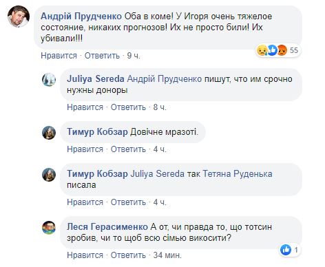 "Обидва в комі! У Ігоря дуже важкий стан, ніяких прогнозів! Їх не просто били! Їх вбивали!!!", - повідомив користувач Андрій Прудченко.