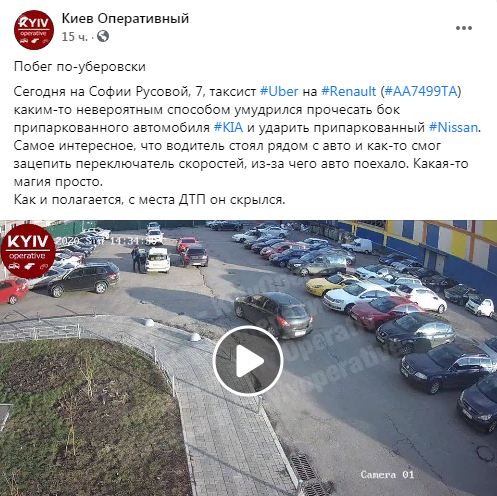 Про це у Facebook повідомив "Київ Оперативний". Повідомляється, що дорожньо-транспортна пригода сталася на вулиці Софії Русової, 7 в неділю, 27 грудня. Автор публікації зазначив, що автомобіль Renault, який належав компанії-перевізнику Uber, вдарив автомобіль KIA і в довершення розбив припаркований Nissan.