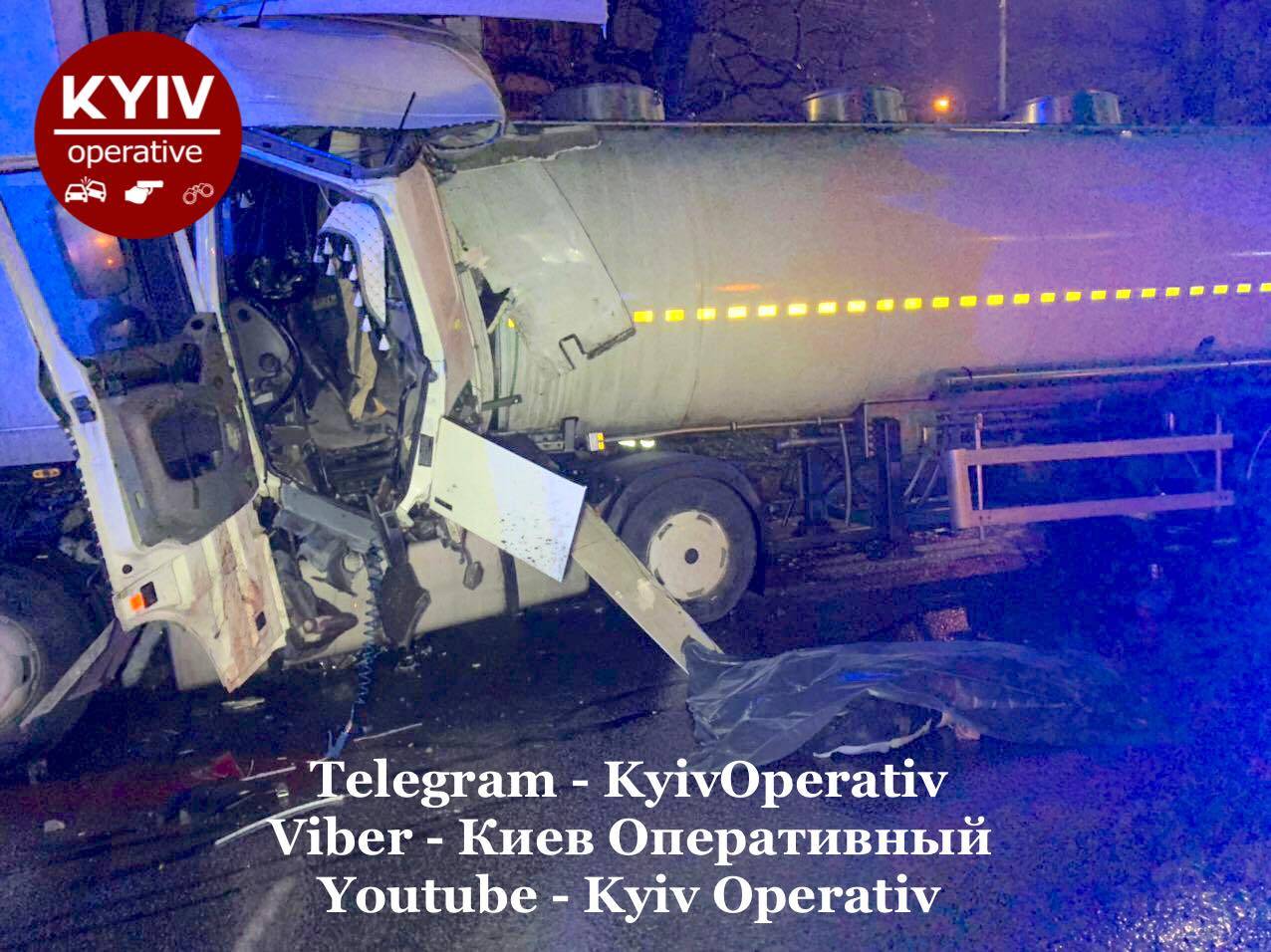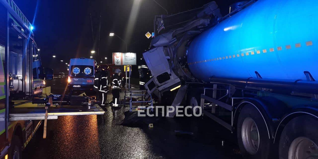 Про це повідомили у Facebook "Київ Оперативний" та "Вартові еспресо". Повідомляється, що з невідомих причин водій автоцистерни DAF, яка, за одними відомостями, перевозила молоко, а за іншими - бензин, врізався в припарковану вантажівку Renault. Аварія, судячи з відео з місця подій, сталася близько 4 години ранку у вівторок, 2 грудня.