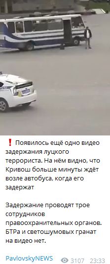 "З'явилося ще одне відео затримання луцького терориста. На ньому видно, що Кривош більше хвилини чекає біля автобуса, коли його затримають. Затримання проводять троє співробітників правоохоронних органів. БТРа і світлошумових гранат на відео немає", - повідомляє канал під опублікованим медіафайлом.