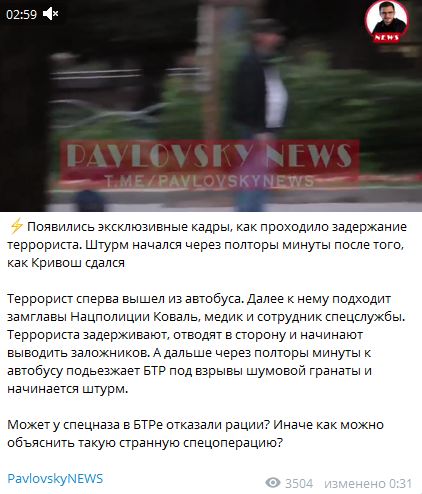 Також каналом були представлені ще два ролика, пов'язані із затриманням Кривоша. "Терорист спершу вийшов з автобуса. Далі до нього підходить заступник голови Нацполіції Коваль, медик і співробітник спецслужби. Терориста затримують, відводять убік і починають виводити заручників. А далі через півтори хвилини до автобусу під'їжджає БТР під вибухи шумової гранати і починається штурм", - повідомляє Телеграм-канал Pavlovsky News.