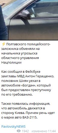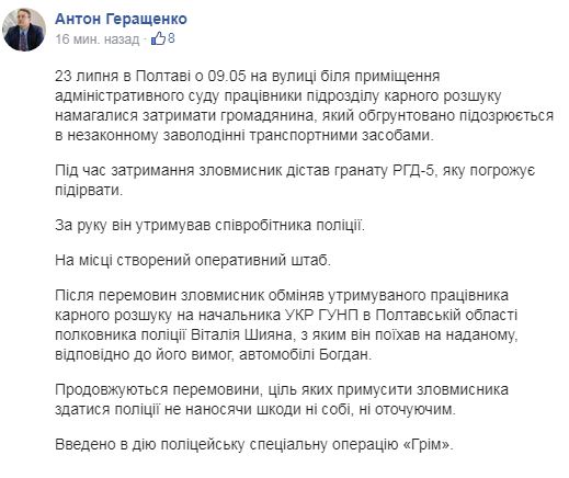 "Після переговорів зловмисник обміняв утримуваного працівника карного розшуку на начальника УКР ГУНП у Полтавській області полковника поліції Віталія Шияна, з яким він поїхав на наданому відповідно до його вимог автомобілі Богдан. Тривають переговори, мета яких змусити зловмисника здатися поліції, не завдаючи шкоди ні собі, ні оточуючим. Введена в дію поліцейська спеціальна операція "Грім", - повідомляє Геращенко.