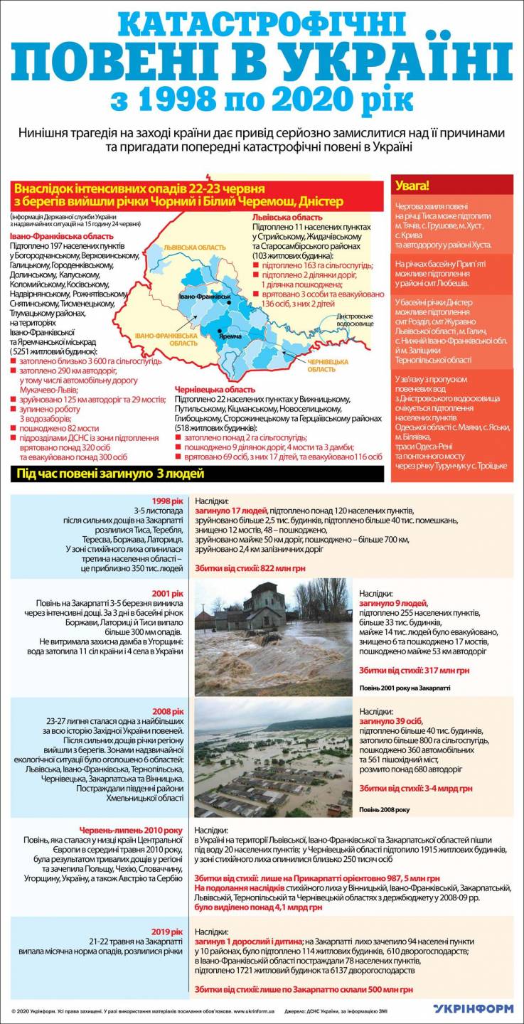 З 1998 року в Україні вже було 6 масштабних повеней, які завдали величезних збитків людям. Про це йдеться в інфографіці "Укрінформу".