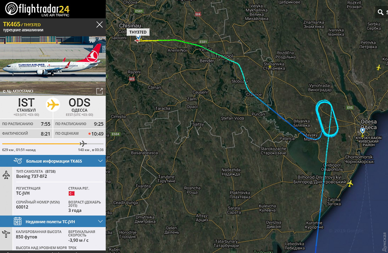 Рейс Стамбул-Одеса турецького національного авіаперевізника Turkish Airlines також зіткнувся з проблемами. Покружлявши в зоні очікування приблизно півгодини, турецькі пілоти пішли на посадку в аеропорт столиці Молдови.
