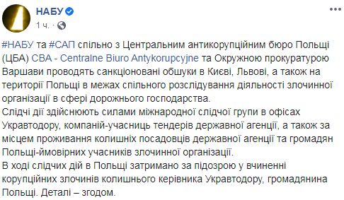 Про це заявила пресслужба НАБУ 20 липня у Facebook. "Слідчі дії здійснюють силами міжнародної слідчої групи в офісах Укравтодору, компаній-учасниць тендерів державного агентства, а також за місцем проживання колишніх посадових осіб державного агентства і громадян Польщі - ймовірних учасників злочинної організації. Під час слідчих дій у Польщі затримано за підозрою в скоєнні корупційних злочинів колишнього керівника Укравтодору, громадянина Польщі", - повідомили в НАБУ, зазначивши, що подробиці події повідомлять пізніше.